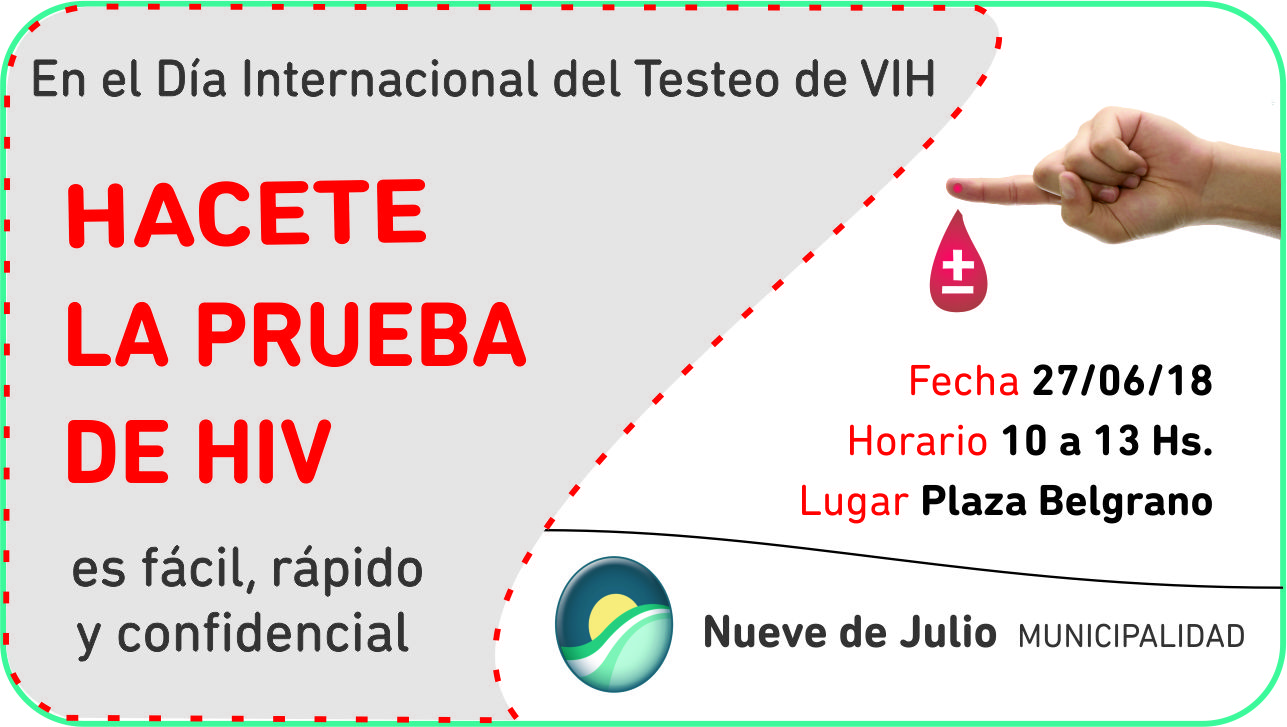 Conmemorando el Día Mundial del testeo de HIV, el próximo miércoles 27 de junio, la Secretaría de Salud de la Municipalidad de Nueve de Julio realizará una jornada intensiva en Plaza Belgrano, entre las 10 y 13 horas.
