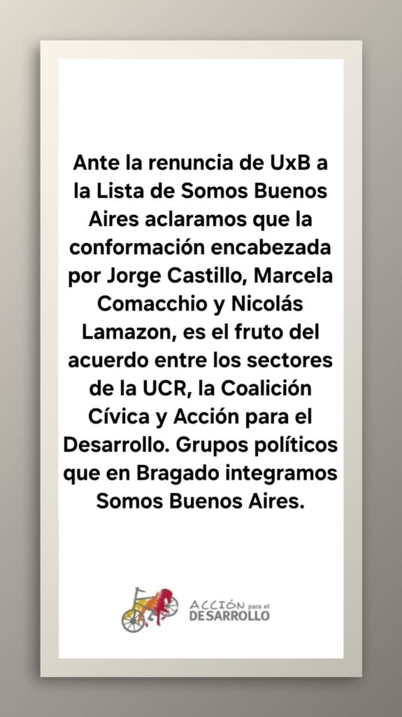 Acción para el Desarrollo, integrante en Bragado de la alianza «Somos Buenos Aires», realiza una aclaración, luego de la decisión de «Unidos por Bragado» de bajarse de la lista de la alianza antes mencionada.