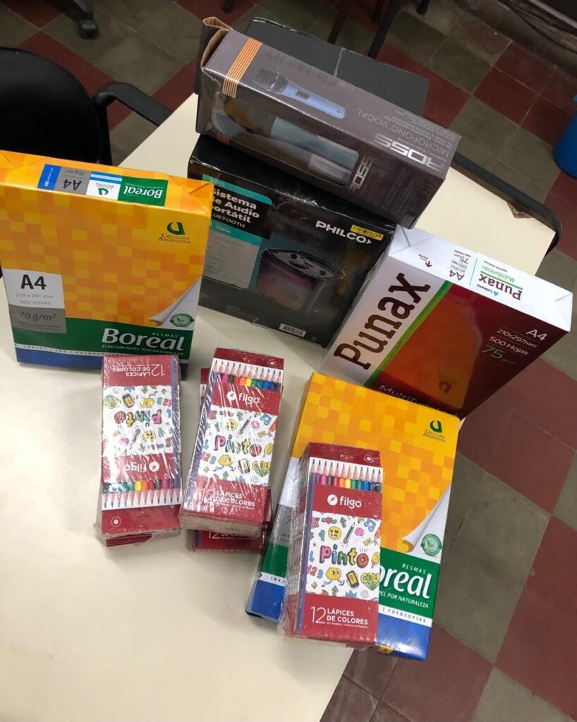 .Escuela 35: «completamos lo prometido en la visita, donamos 5 pelotas de básquet, un aro de básquet, 3 resmas de papel, 1 lata de pintura de 20 litros, 40 cajas de lápices, 1 parlante con su micrófono. También colaboramos con 100 mil pesos para los egresados de la secundaria 9».